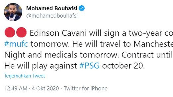 Informasi Cavani ke Old Trafford juga diinfokan Mohammed Bouhafsi. Foto: Screenshoot