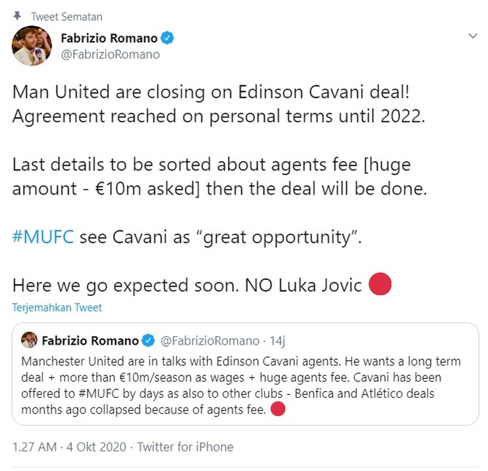 Kabar Cavani ke Man United tak lain informasi yang dicuitan Fabrizio Romano. Kalimat magis "here we go" sebagai penanda bahwa transfer ini akan segera terwujud dalam waktu dekat. Foto: Screenshoot