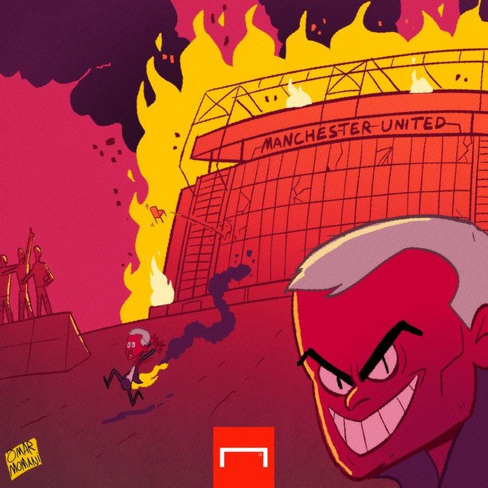 Old Trafford digambarkan terbakar. Foto: istimewa