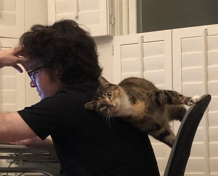 Si kucing bersandar di punggung pemiliknya. Foto: Brightside