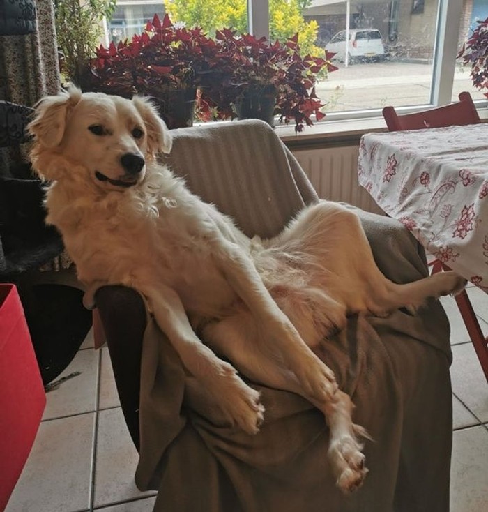 Anjing ini sangat suka duduk bersama majikannya di meja. Foto: Brightside