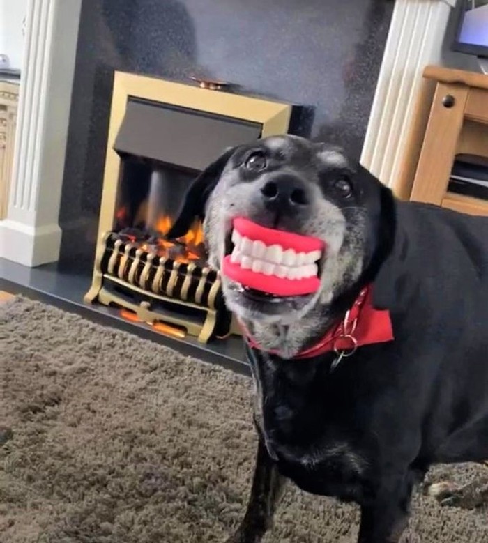 Mainan favorit anjing ini adalah gigi palsu yang sering dipakai dan dipamerkan. Foto: Brightside