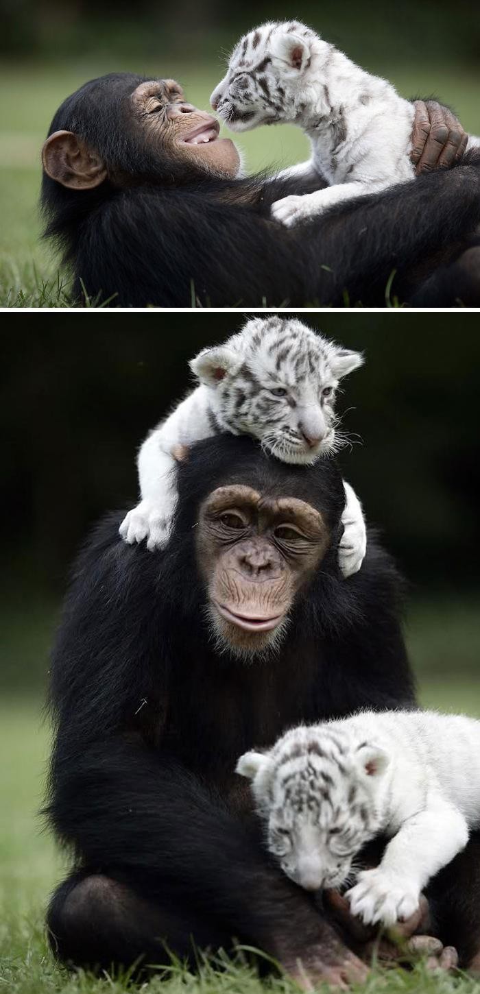 Begitu akrab simpanse dengan anak harimau putih. Foto: Boredpanda
