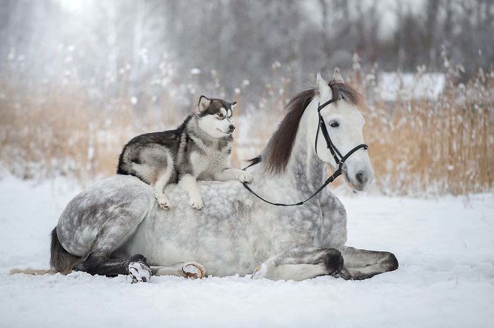 Foot yang keren anjing dan kuda saat salju. Foto: Boredpanda