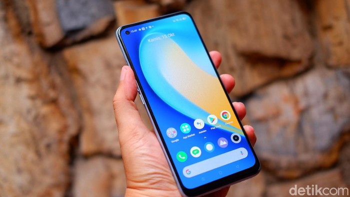 Realme 7 Pro menggunakan panel Super AMOLED berukuran 6,4 inch dengan resolusi 1.080 x 2.400 pixel. Layar Realme 7 Pro menggunakan desain punch hole yang dilindungi dengan Corning Gorilla Glass 3+ dan memiliki fitur Always-on display. Foto: Adi Fida Rahman/detikINET