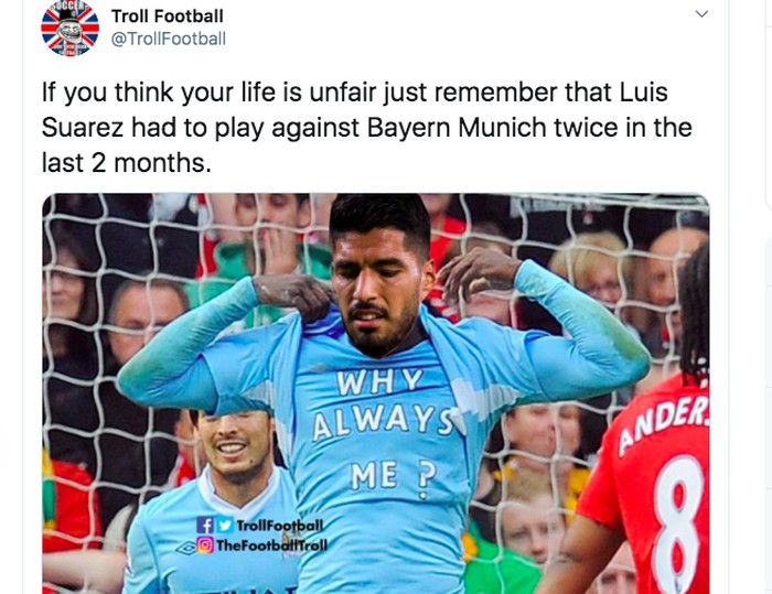 "Jika Anda pikir hidup tidak adil, ingat saha Luis Suarez harus bermain lawan Bayern Munich dua kali dalam 2 bulan terakhir," tulis meme ini. Foto: istimewa