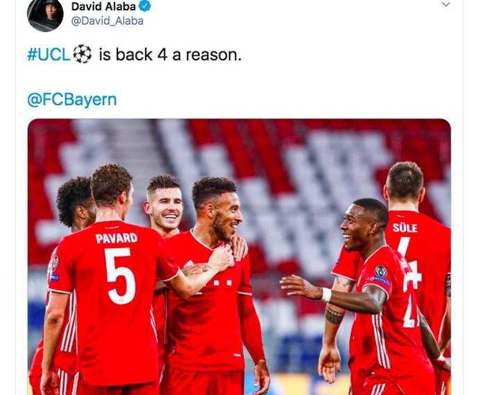 Liga Champions sudah kembali 4 a reason tulis David Alaba di Twitter. Angka 4 menggambarkan skor Bayern lawan Atletico. Foto: istimewa