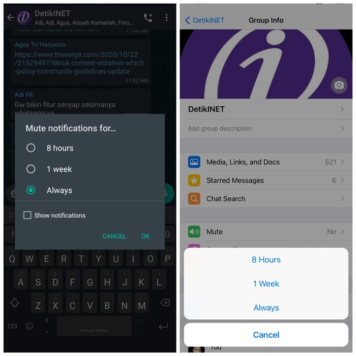 Fitur mute selamanya grup WhatsApp. Caranya buka chat baik personal maupun grup > Tekan bagian atas percakapan > Tekan bagian Mute > Lalu akan muncul opsi rentang durasi Mute, pilih opsi Always atau Selalu. Setelah diaktifkan, kamu tidak akan menerima notifikasi tiap kali ada pesan masuk selamanya. Opsi ini sangat berguna bagi kamu yang tidak ingin terganggu oleh percakapan grup yang begitu aktif. Foto: detikINET