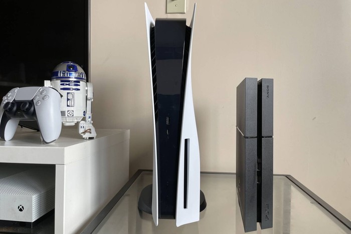 PS5 dibandingkan dengan PS4. Memang konsol game terbaru dari Sony ini gambot alias besar, dalam sentuhan desain futuristik. Foto: istimewa