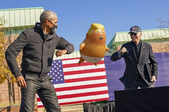 Foto aslinya diambil saat kampanye Biden yang didukung Obama di Michigan beberapa waktu silam. Foto ini jadi media adu Photoshop di Reddit. Ini salah satunya, ada penampakan boneka Donald Trump di antara keduanya. Foto: Imgur