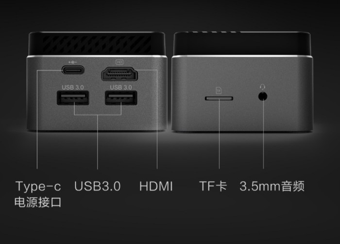 Media penyimpanannya menggunakan SSD M.2 dengan kapasitas 128 GB atau 256 GB. Pada bagian belakangnya, terdapat port HDMI untuk menghubungkan komputer mini ini ke monitor atau proyektor dengan resolusi hingga 4K, ada juga dua buah port USB Type-A (3.0), dan satu konektor USB tipe C. Foto: Gizmochina