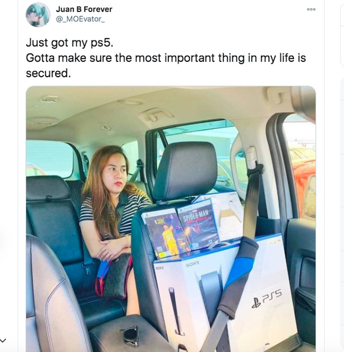Saking senangnya, PS5 ini diperlakukan hati-hati dengan sabuk pengaman. Foto: istimewa