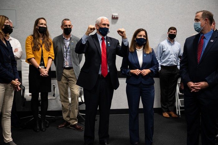Wakil Presiden AS Mike Pence ikut menonton langsung peluncuran misi Crew-1 bersama Administrator NASA Jim Bridenstine. CEO SpaceX Elon Musk absen dari event ini karena sakit yang diduga gejala COVID-19. Foto: (NASA/Aubrey Gemignani)/NASA/Aubrey Gemignani