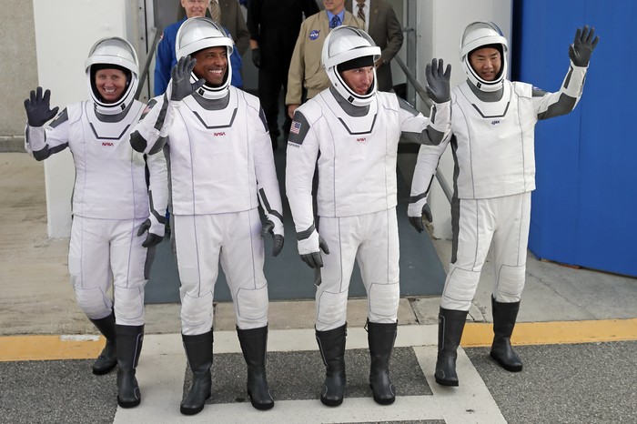 Keempat astronaut sesaat sebelum peluncuran. Tiga di antaranya adalah astronaut NASA Michael Hopkins, Victor Glover dan Shannon Walker. Foto: AP/Chris O'Meara