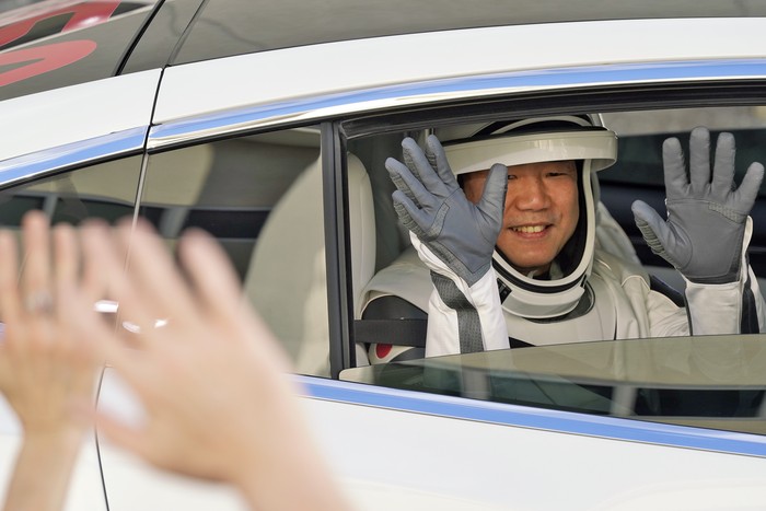 Keempat astronaut menuju lokasi landasan peluncuran Launch Pad 39-A menggunakan mobil Tesla. Foto: AP/Chris O'Meara