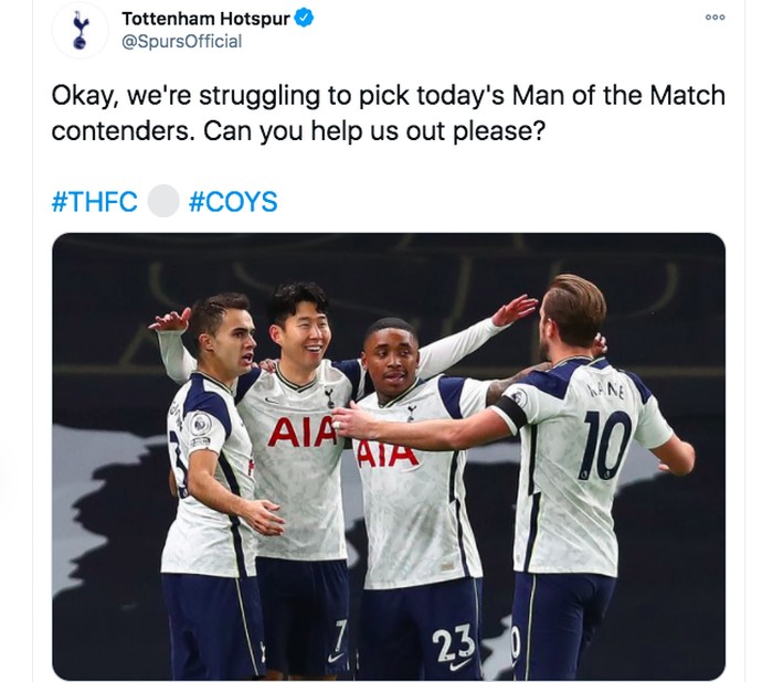 Akun Twitter Spurs mengaku sampai bingung memilih siapa pemain Man of The Match semalam. Foto: istimewa