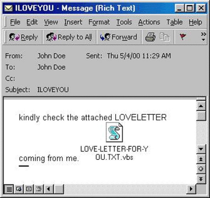 Loveletter menyebar pada 2000 dan menginfeksi 50 juta komputer dalam 9 hari. Menyebar melalui email dengan subjek βI Love Youβ yang berisikan lampiran yang jika dibuka langsung mereplikasikan dirinya dan mengirim ke semua alamat dalam email pengguna. File ini juga akan menghapus file .jpg dan .jpeg. Foto: istimewa