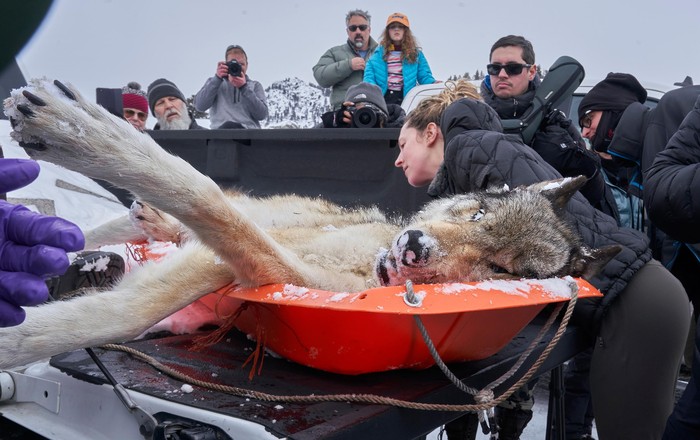 Pemenang kategori Ecology in Action adalah Peter Hudson dengan karyanya 'Wolf Fascination'. Foto ini memperlihatkan sekelompok turis yang mengelilingi seorang wanita yang sedang memeriksa serigala yang mati di pertarungan. Foto: Peter Hudson/British Ecological Society Photography Competition