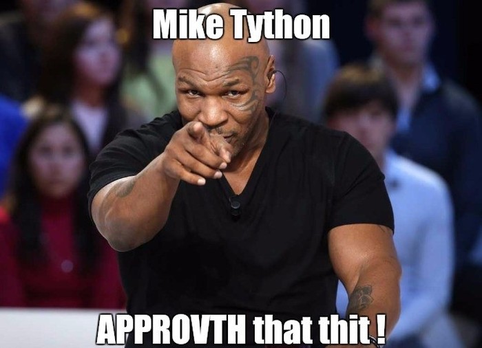 Mike Tyson itu cadel, tidak bisa mengucapkan huruf 'S'. Dia mengucapnya 'Th'. Ciri khas meme Mike Tyson selalu mengubah ejaan 'S' menjadi 'Th'Β (Pinterest)