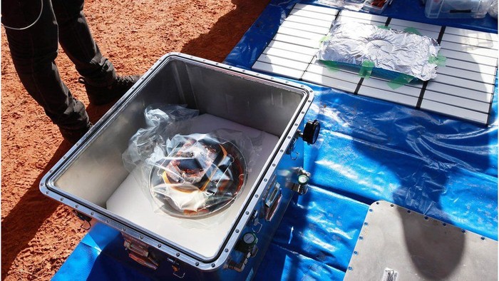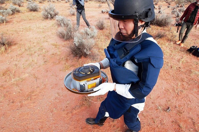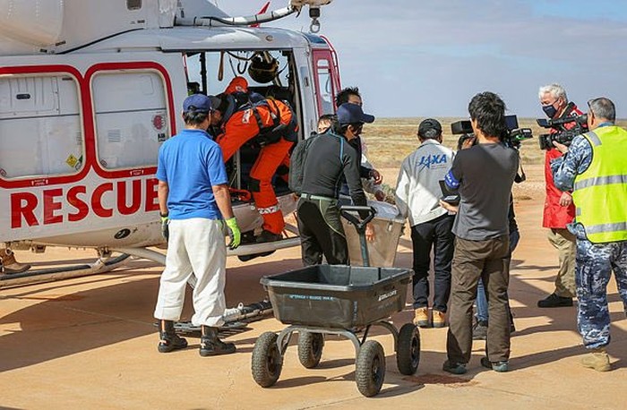 Helikopter menjadi sarana transportasi untuk membawanya. Tim di Australia telah mengambilnya untuk kemudian dikirimkan ke Jepang untuk riset lebih lanjut. Foto: JAXA