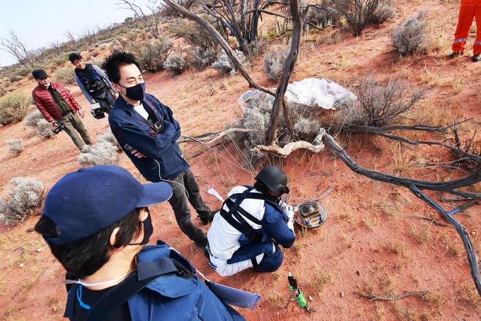 Tim dengan pakaian lengkap segera melakukan proses pengambilan. Foto: JAXA