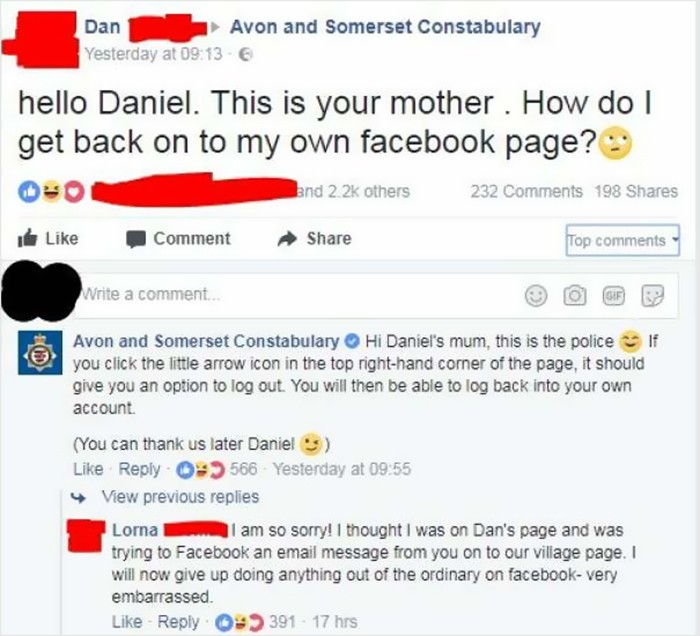 Ibu Daniel yang kesulitan kembali ke akun Facebook-nya, sampai tidak sengaja meminta tolong ke akun Facebook kepolisian. Foto: Bored Panda