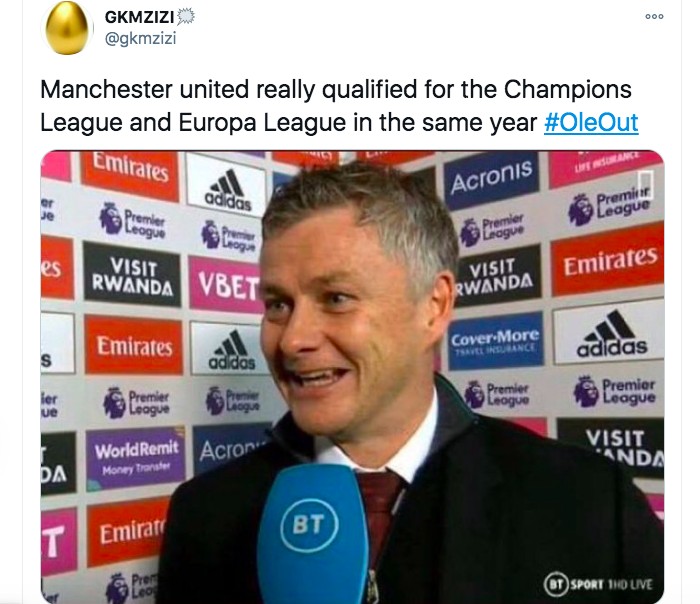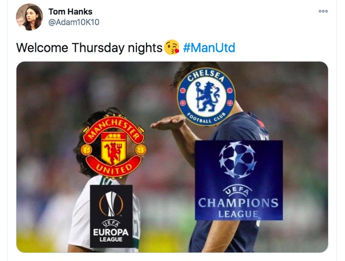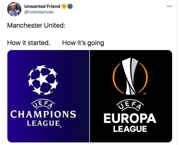 MU masuk ke Liga Champions dan Liga Europa di tahun yang sama, sindir meme ini. Foto: Twitter