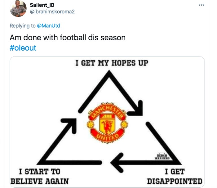 Menjadi fans MU kadang harapan jadi membumbung tapi berujung kecewa, lalu mulai yakin lagi, berharap lagi, kecewa lagi, dan begitu seterusnya seperti lingkaran setan. Foto: Twitter