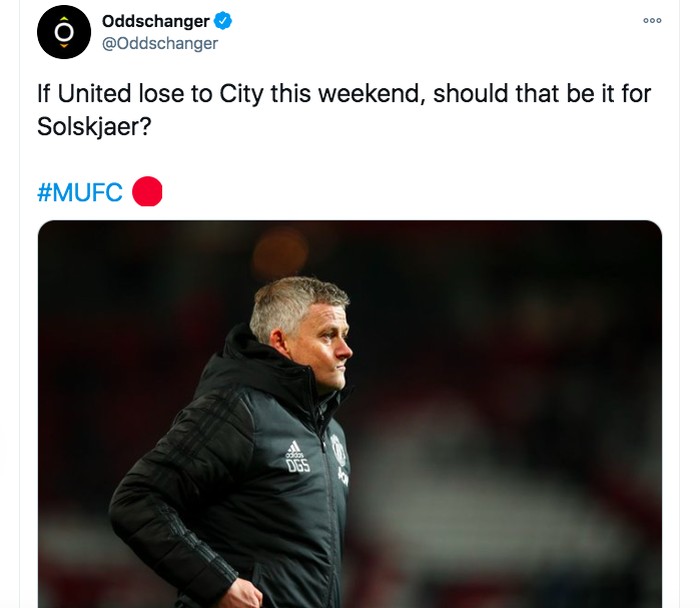 Nasib Solksjaer sepertinya kritis karena MU akan menghadapi Manchester City. Foto: Twitter