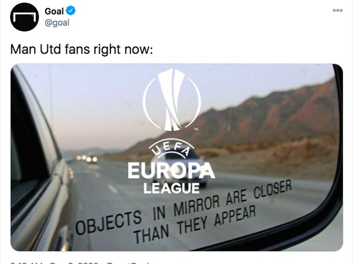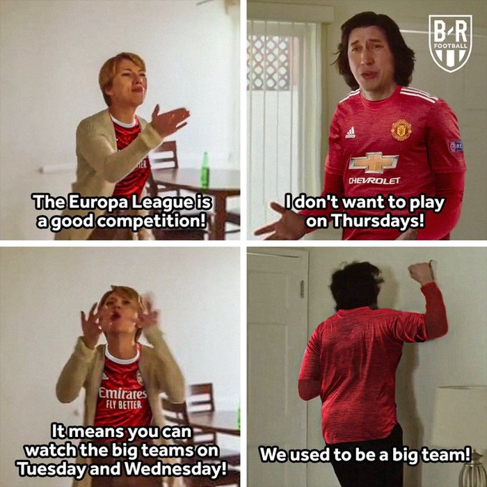 MU digambarkan tidak mau main di Europa League tapi dijawab bahwa tidak apa-apa karena Europa League kompetisi cukup bagus dan MU bisa melihat tim terbaik bertanding di Liga Champions. "Tapi kami dulu juga tim besar," protes MU. Foto: Twitter