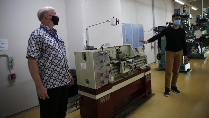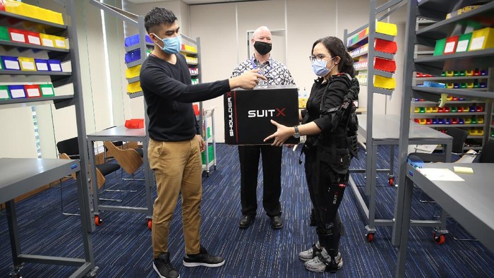 President of Sampoerna University Dr Marshall Schott didampingi Head of Mechanical and Manufacturing Lab of Sampoerna University Aditiya Harjon, M.Phil menjelaskan berbagai fasilitas laboratorium yang dimiliki Faculty of Engineering & Tecnology Sampoerna University termasuk alat Exoskeleton suit yang berfungsi membantu pekerja untuk tetap aman memindahkan barang berat dalam rangkaian acara Faculty Tour βBright Future Festivalβ di Sampoerna University, L'Avenue Building, Pancoran, Jakarta Selatan, Jumat (11/12/2020).