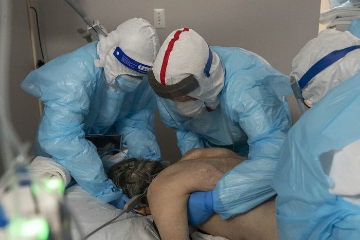 Staf nakes tengah membalik posisi tubuh pasien. Foto: Go Nakamura via Boredpanda