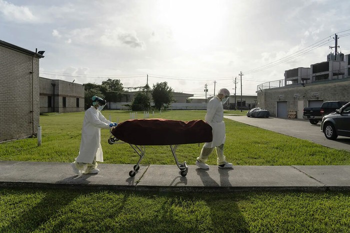 Staf nakes dengan APD lengkap membawa jenazah pasien COVID-19. Foto: Go Nakamura via Boredpanda