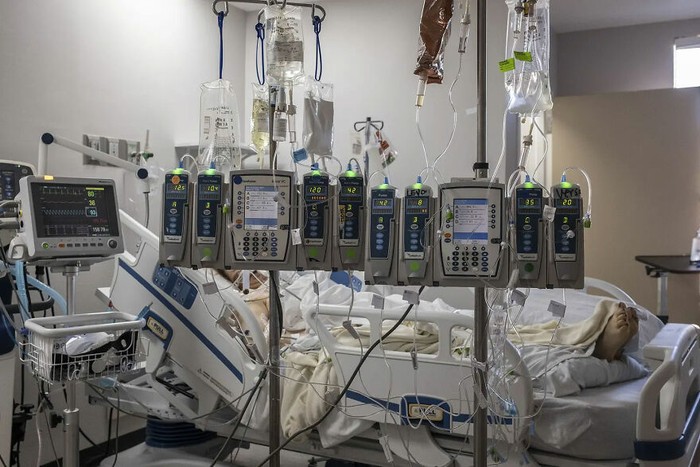 Pompa Iv dan Mesin Elektrokardiogram terpasang di salah satu kamar pasien di Unit Perawatan Intensif COVID-19 di Houston Foto: Go Nakamura via Boredpanda