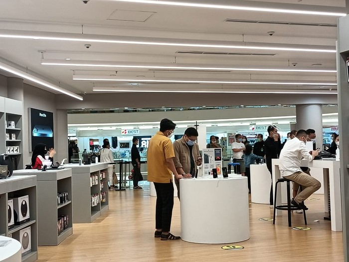 Warga mengantre untuk masuk iBox di Senayan City, Jakarta Selatan, untuk membeli iPhone 12 atau sekadar melihat-lihat.