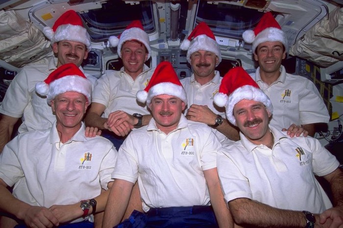 Awak STS-103 yang bertugas memperbaiki teleskop luar angkasa Hubble merayakan Natal di pesawat ulang alik Discovery pada tahun 1999. Foto: NASA