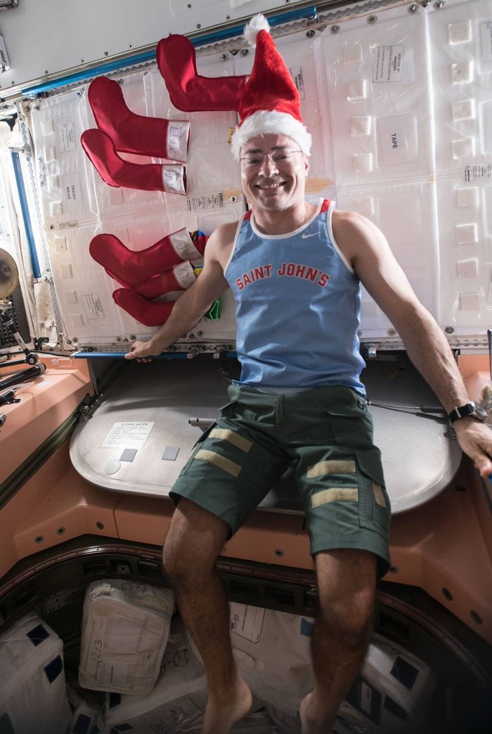 Anggota Expedition 42 meninggalkan kukis dan susu untuk Santa Claus dan menghiasi Joint Airlock di ISS dengan pernak-pernik Natal. Foto: NASA