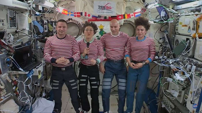 Anggota Expedition 61 Andrew Morgan, Christina Koch, Luca Parmitano dan Jessica Meir berbagi pesan Natal mereka dalam video. Foto: NASA