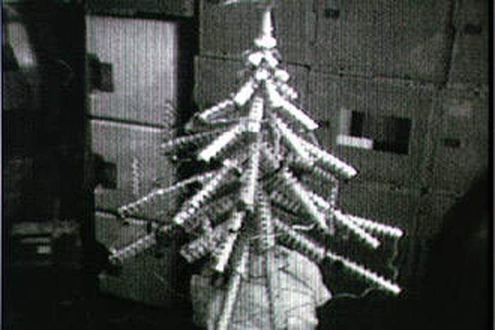 Perayaan Natal pertama di luar angkasa oleh awak stasiun luar ankasa Skylab pada tahun 1973. Pohon Natal ini dibuat menggunakan kaleng makanan yang dikumpulkan oleh astronaut. Foto: NASA