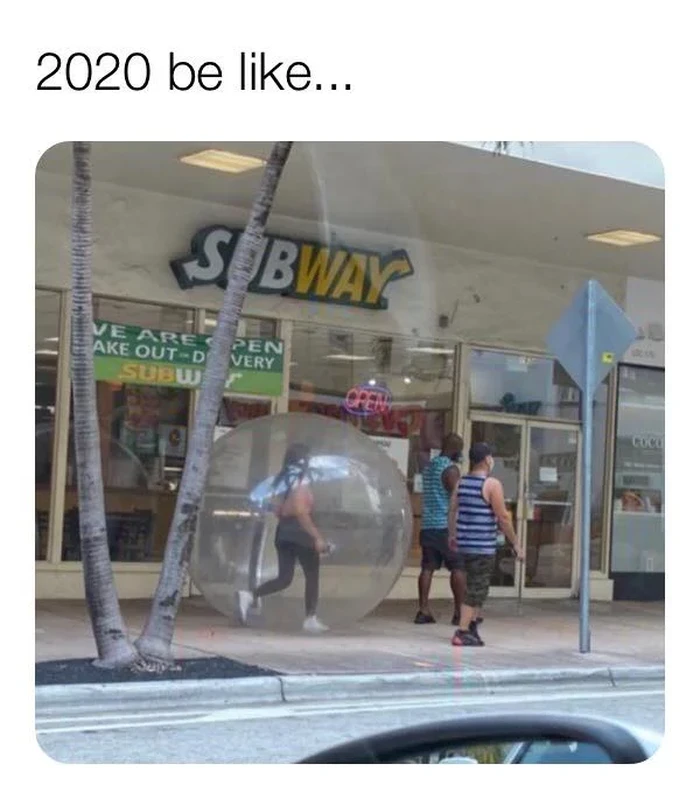 Di tahun 2020 pakai masker saat keluar rumah saja tidak cukup, kalau bisa memakai bubble pelindung sendiri. Foto: Twitter