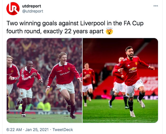 Kebetulan 22 tahun berselang, MU juga mengalahkan Liverpool di babak keempat piala FA. Foto: istimewa