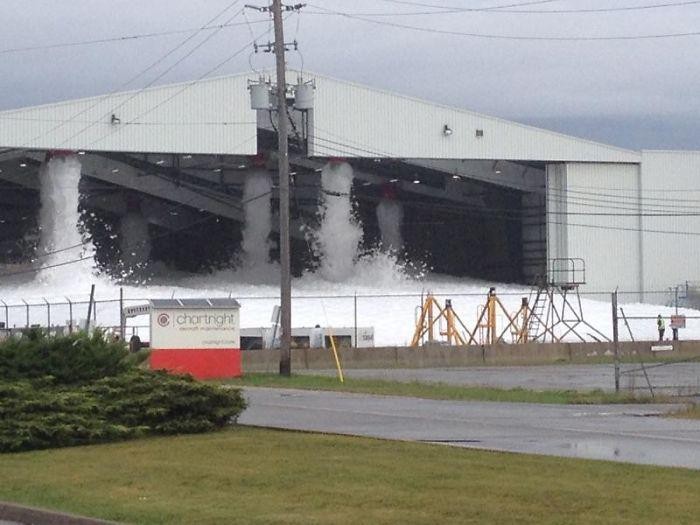 Sistem pemadam kebakaran di hanggar pesawat sedang bekerja. Foto: Bored Panda