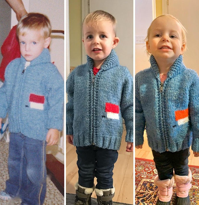 Sang ibu memakai jaket ini ketika masih kecil di tahun 1981 yang kemudian dipakai oleh putranya lalu putrinya karena masih bagus. Itu bendera Indonesia atau Monako ya? Foto: Bored Panda