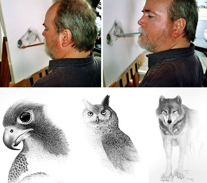 Doug Landis mengalami kelumpuhan pada bagian tubuhnya setelah kecelakaan ketika pertandingan gulat di sekolahnya. Meski demikian ia bisa hasilkan lukisan hewan yang keren melalui mulutnya. Foto: Bored Panda