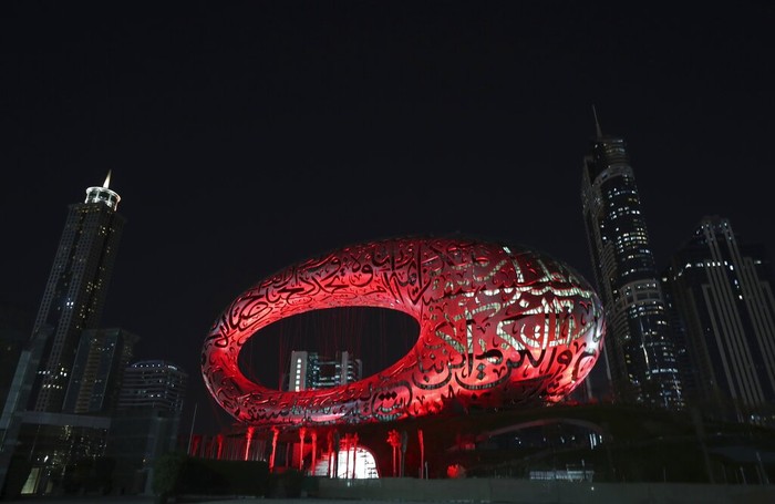 Jelang Hope tiba di Mars, landmark di kota Dubai termasuk Dubai Museum of The Future berselimut cahaya merah. Foto: AP/Kamran Jebreili