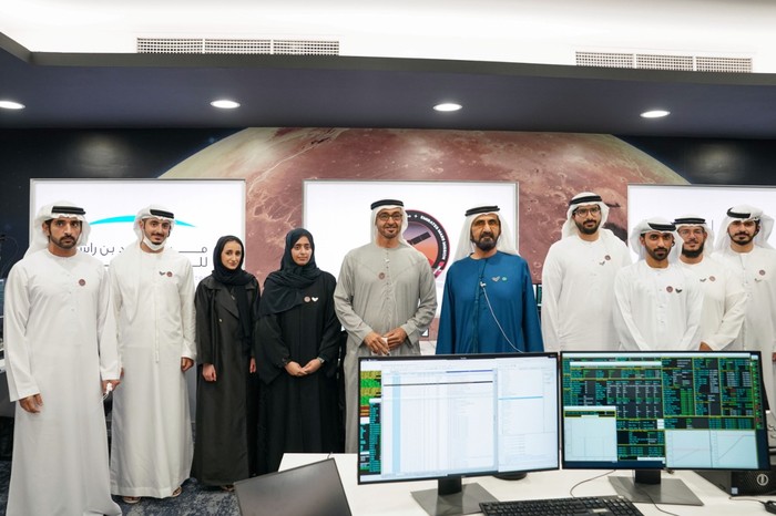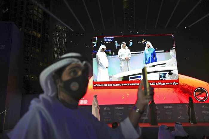 Tim yang menanganinya di Mohammed Bin Rashid Space Centre pun bersorak gembira. Uni Emirat Arab berhasil tiba lebih dulu dibandingkan wahana China dan Amerika Serikat yang juga hampir sampai di Mars. Foto: AP/Kamran Jebreili