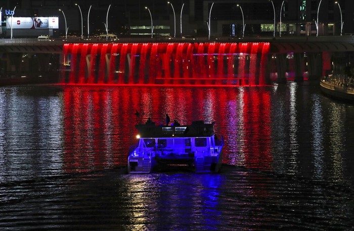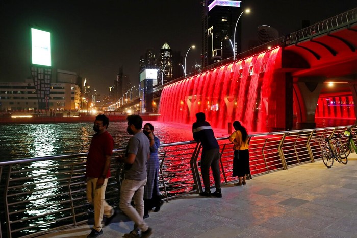 Warga Uni Emirat Arab mengamati Dubai Canal Waterfall yang disinari cahaya merah, di mana Planet Mars memang dijuluki Planet Merah. Foto: AP/Kamran Jebreili