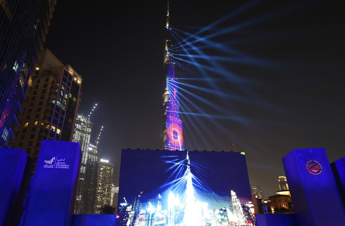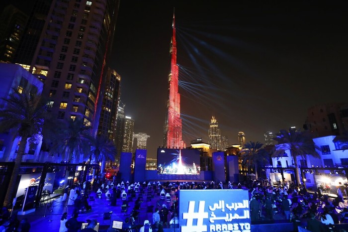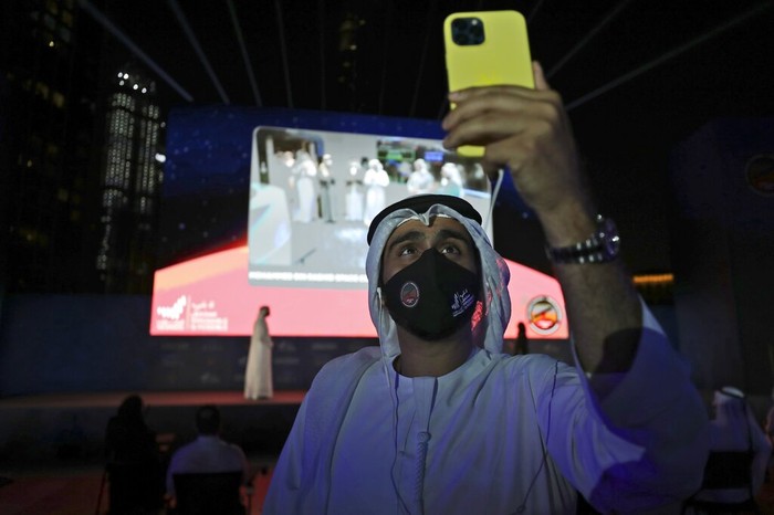 Detik-detik Hope tiba di Mars pun disiarkan langsung dengan layar besar di depan Burj Khalifa. Foto: AP/Kamran Jebreili