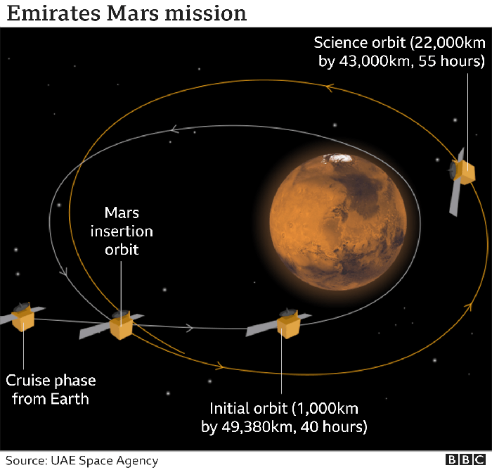Bagan yang memperlihatkan proses pendaratan Hope ke Planet Merah. Foto: Twitter