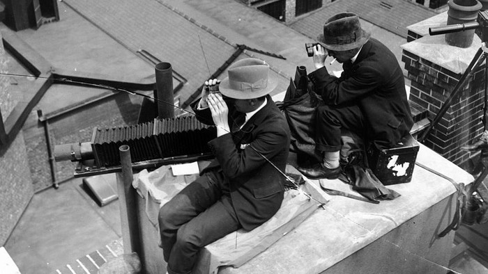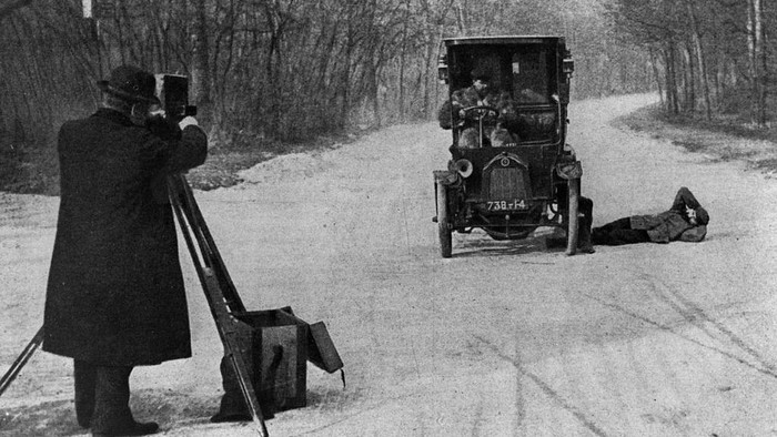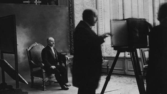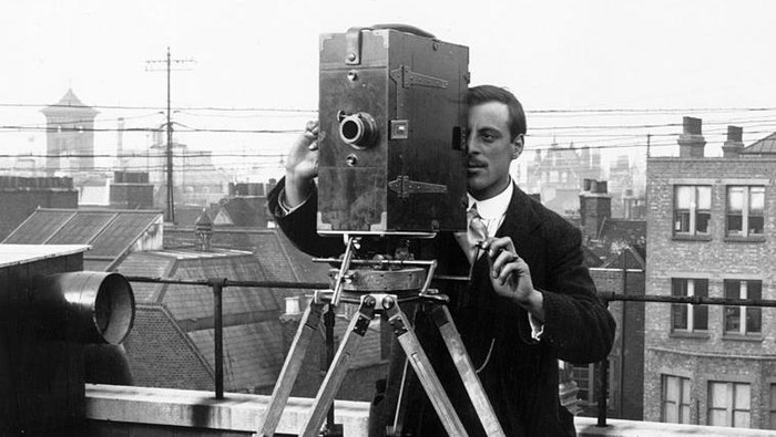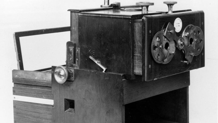 Foto tahun 1912 yang menunjukkan kamera Kinetograf atau kamera film paling awal. Aslinya dipatenkan pada tahun 1891 dan dirancang oleh WKL Dickson yang bekerja di bawah arahan Thomas Alva Edison. Getty Images/Hulton Archive Β